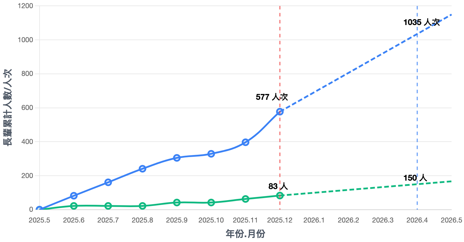 本圖為imuse團隊參與包容為導向之科技計畫之子計畫:音樂包容科技,長輩接觸與使用之人數/人次成長圖。自五月開始,先是以演奏大師、空氣吉他正式融入長照場域課程,漸漸的加入手勢樂器,還有近期最新上線的手臂鋼琴、虛擬長號。本團隊於計畫前期致力於埔里在地社區長照站拓廣,統計後達成了破千的使用人次。也預計於2026開始,將桃園列為首個南投以外的拓點縣市,讓音樂的包容可以漸漸的走向全國。
